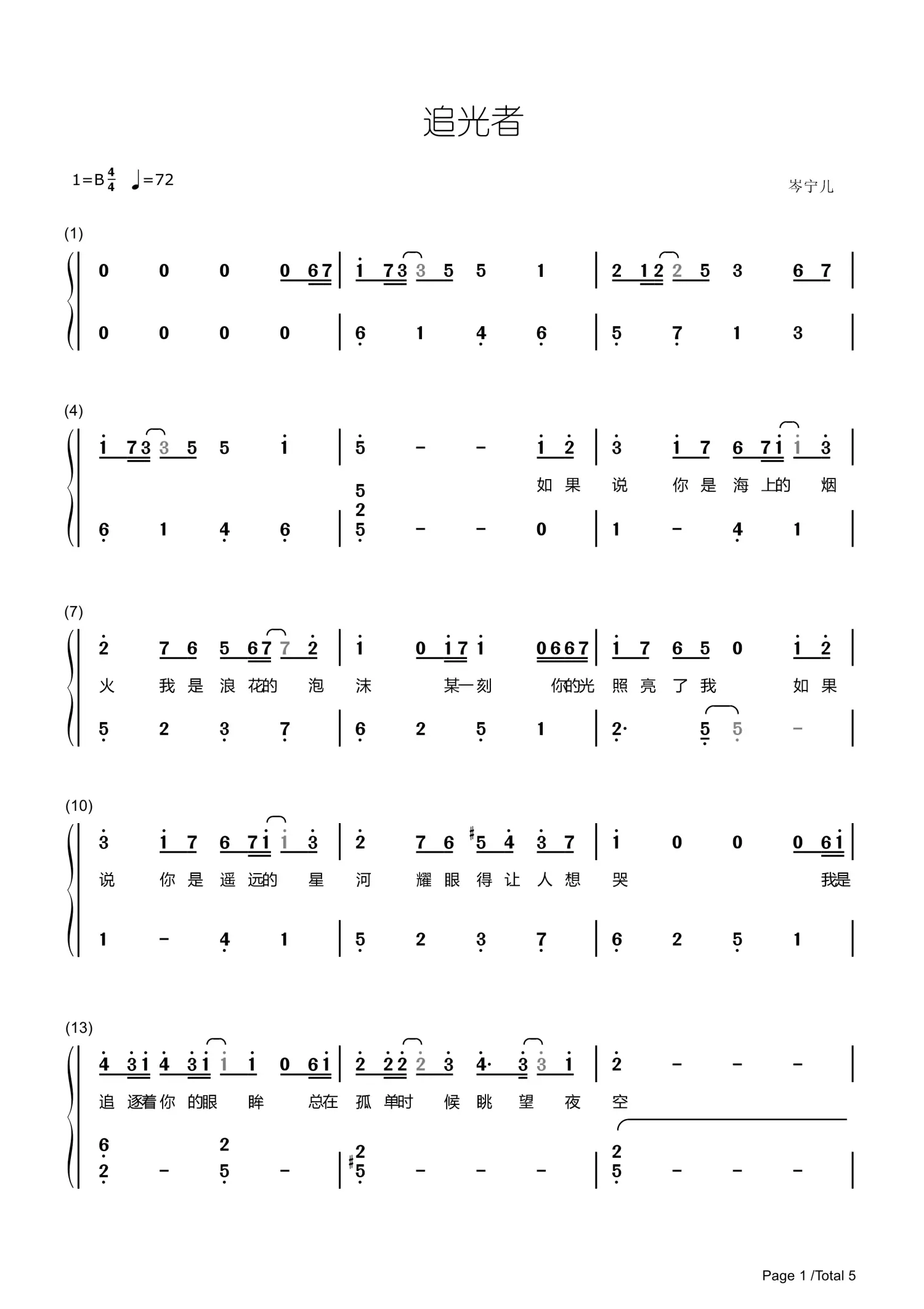 追光者岑宁儿双手数字简谱钢琴谱带歌词