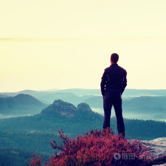 与石南花布什悬崖上穿黑衣服的高个子男人.锋利的落基山脉公园