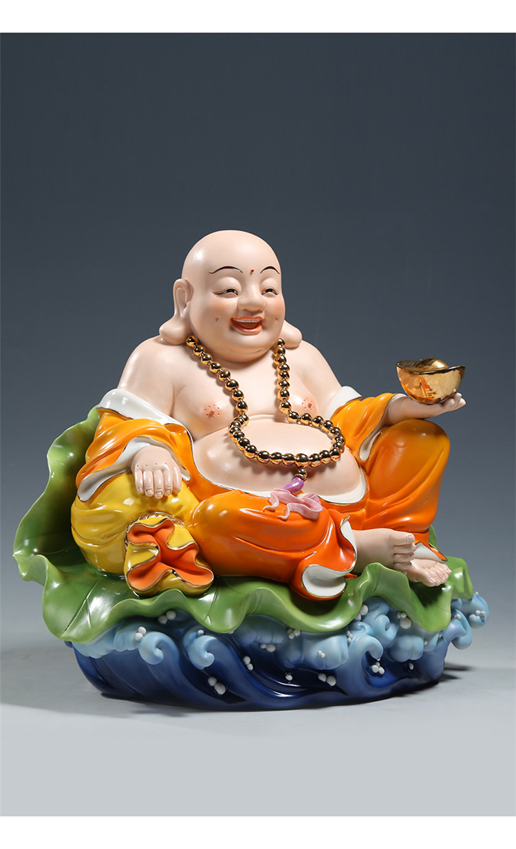 【上美】陶瓷14吋坐荷海浪弥勒桔彩笑佛弥勒佛供奉家用工艺品摆件