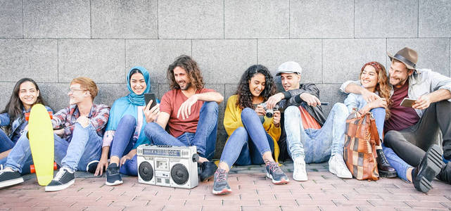 一群多种族的朋友,玩得开心,户外千禧一代年轻人用手机拍照和听音乐