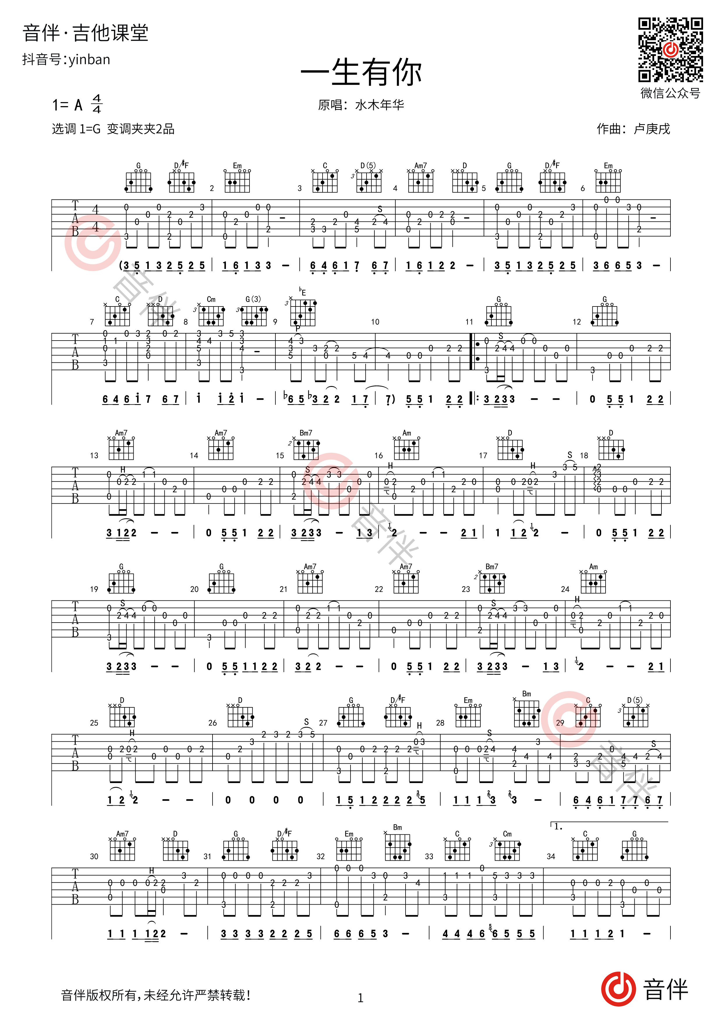 一生有你指弹吉他谱 水木年华 g调高清指弹谱