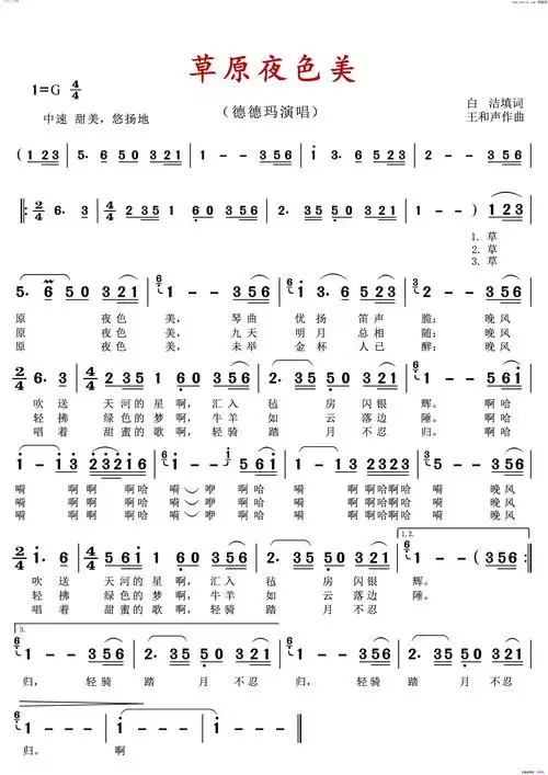 草原夜色美(歌唱谱) 演唱 德德玛 歌谱简谱网