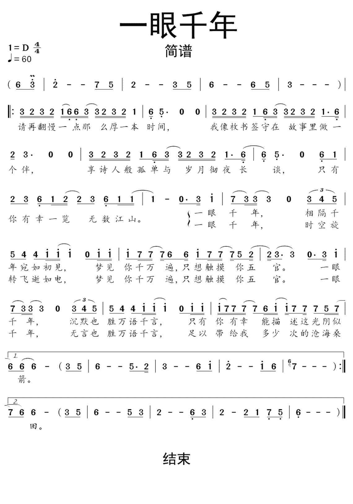一眼千年( 演唱) 何苗 歌谱简谱网