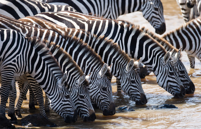 组的斑马从河里喝水