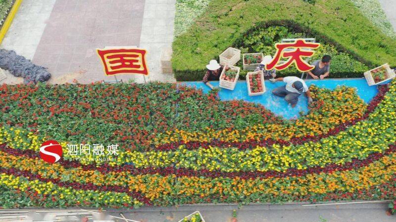 政府门口看到,园林绿化事业发展中心的工作人员正忙着布置国庆草花