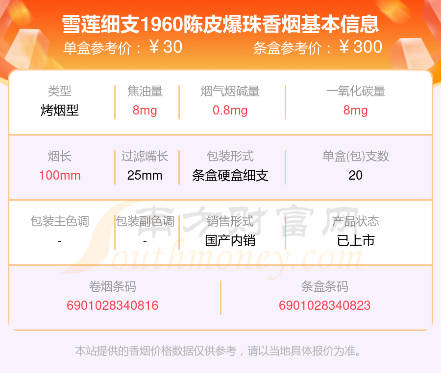 雪莲细支1960陈皮爆珠香烟价格2023一览