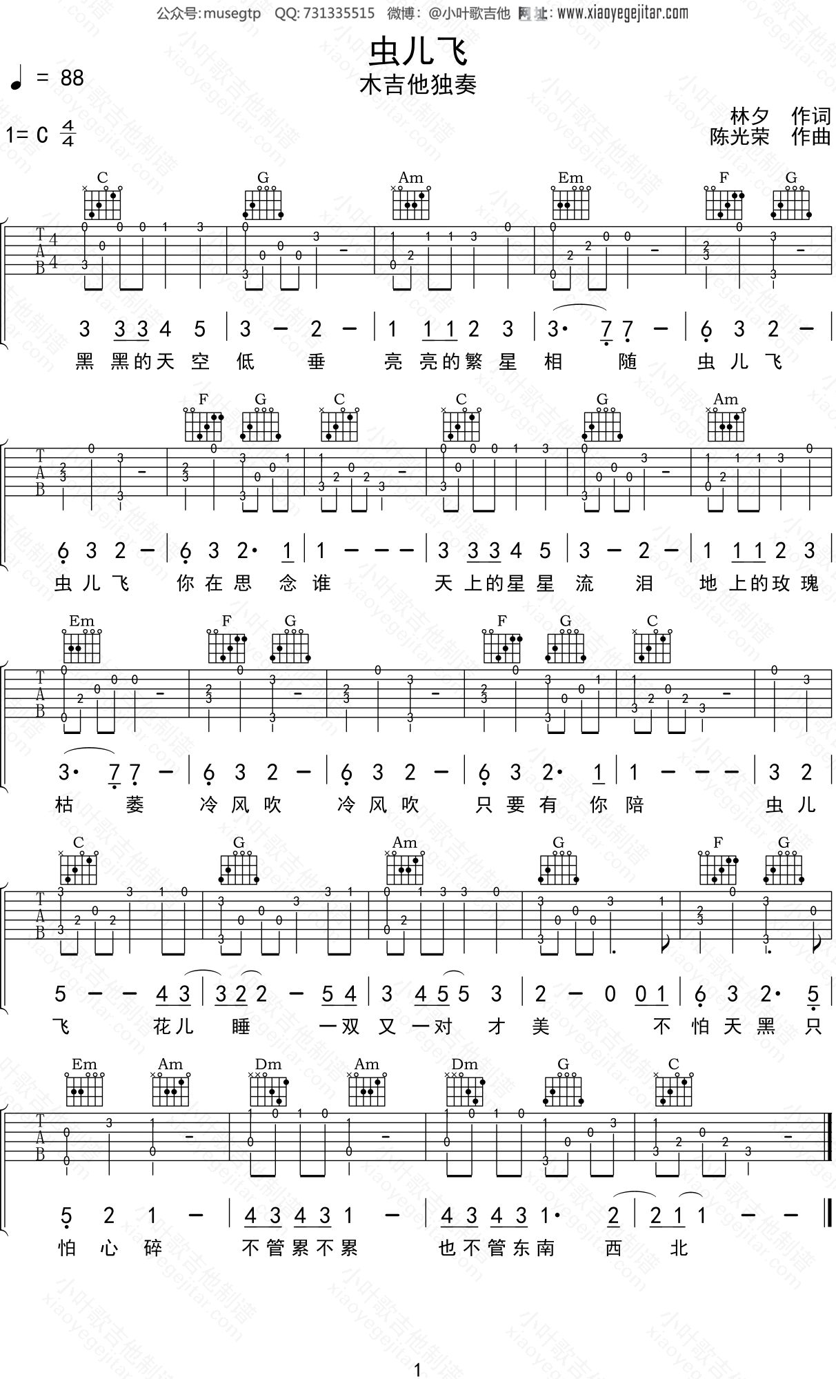 虫儿飞简谱吉他谱