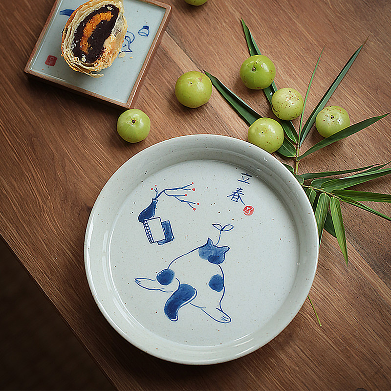 简约陶瓷手绘节气盘子创意青花瓷小猫圆形个性盘
