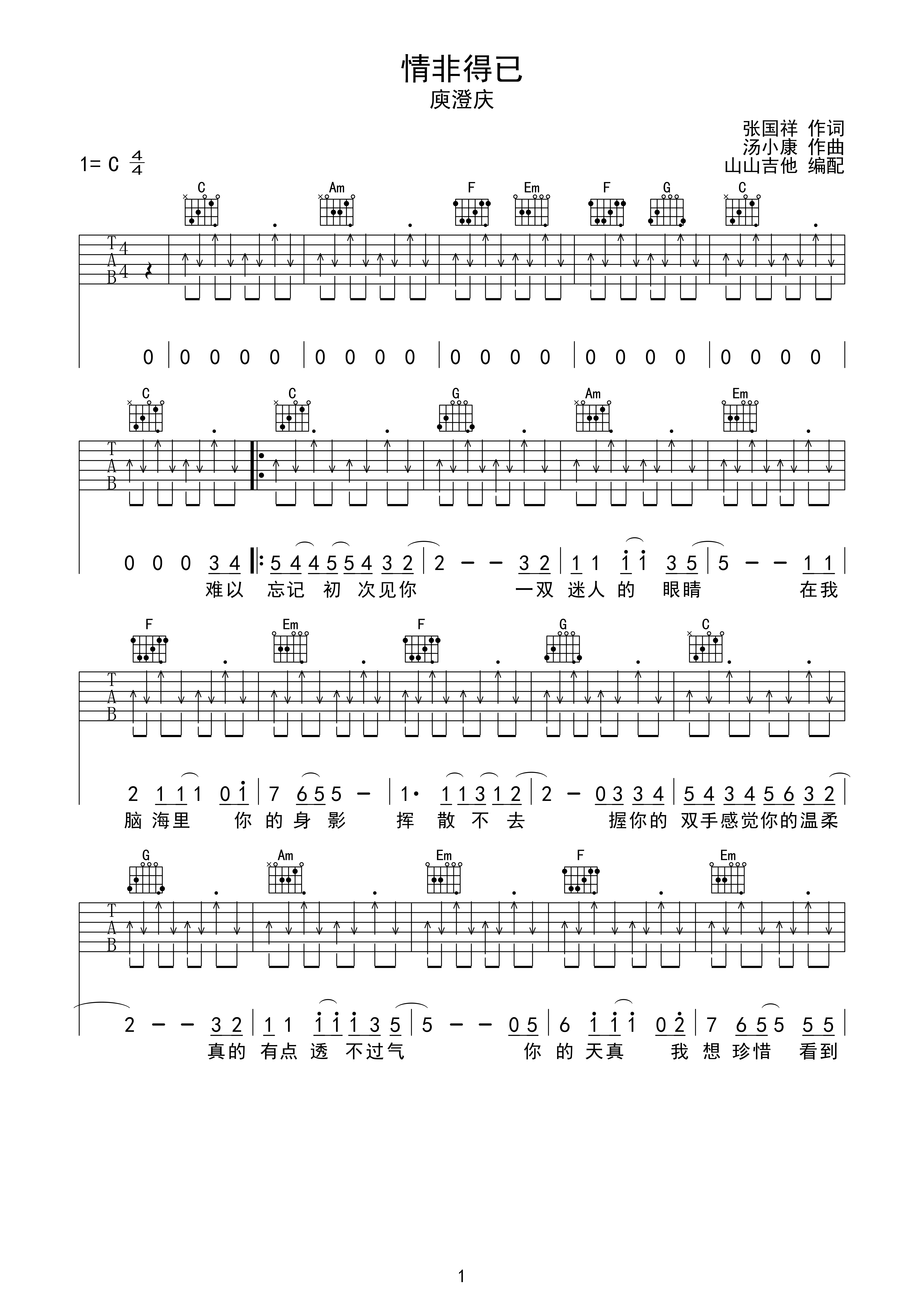 情非得已-庾澄庆 c调拍弦版编配c调六线吉他谱-虫虫吉他谱免费下载