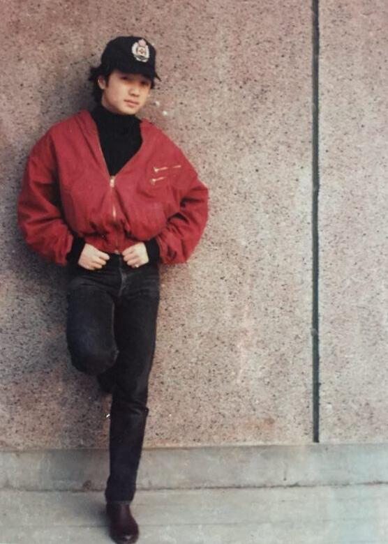 照片中徐峥头发茂密戴着鸭舌帽,一身红色夹克修身牛仔裤的装扮相当