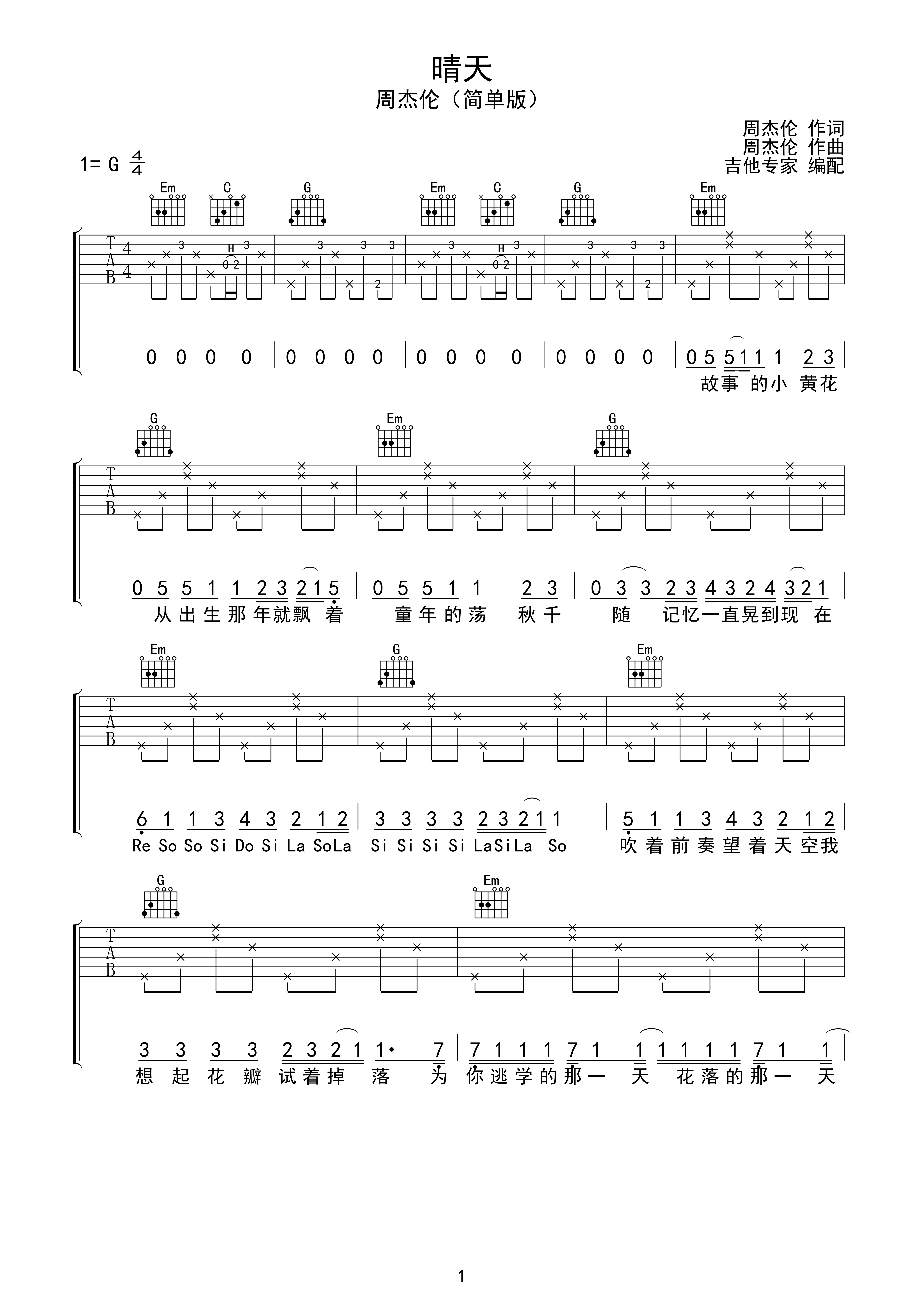 周杰伦《晴天》原调简单版g调六线pdf谱吉他谱-虫虫吉他谱免费下载