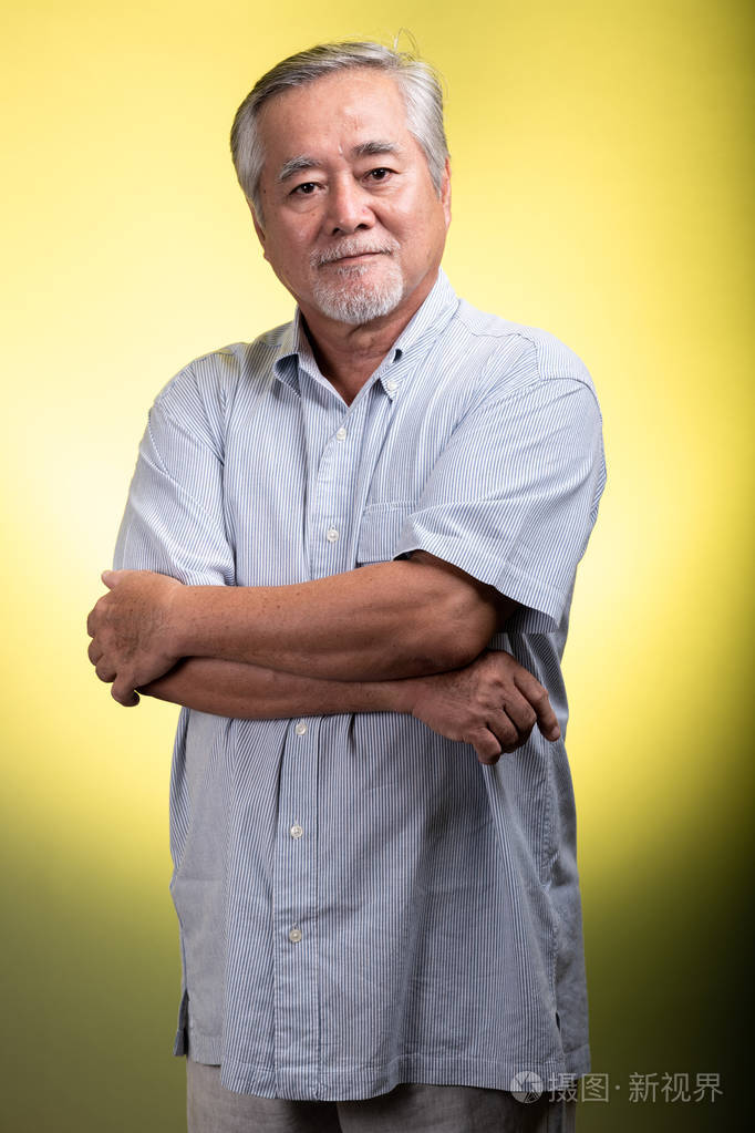 戴着白胡子的亚洲老人站在镜头前微笑. 高级生活方式概念.