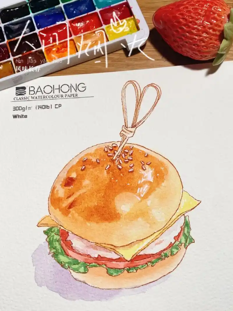 水彩美食|手绘水彩好吃的汉堡包绘画分享