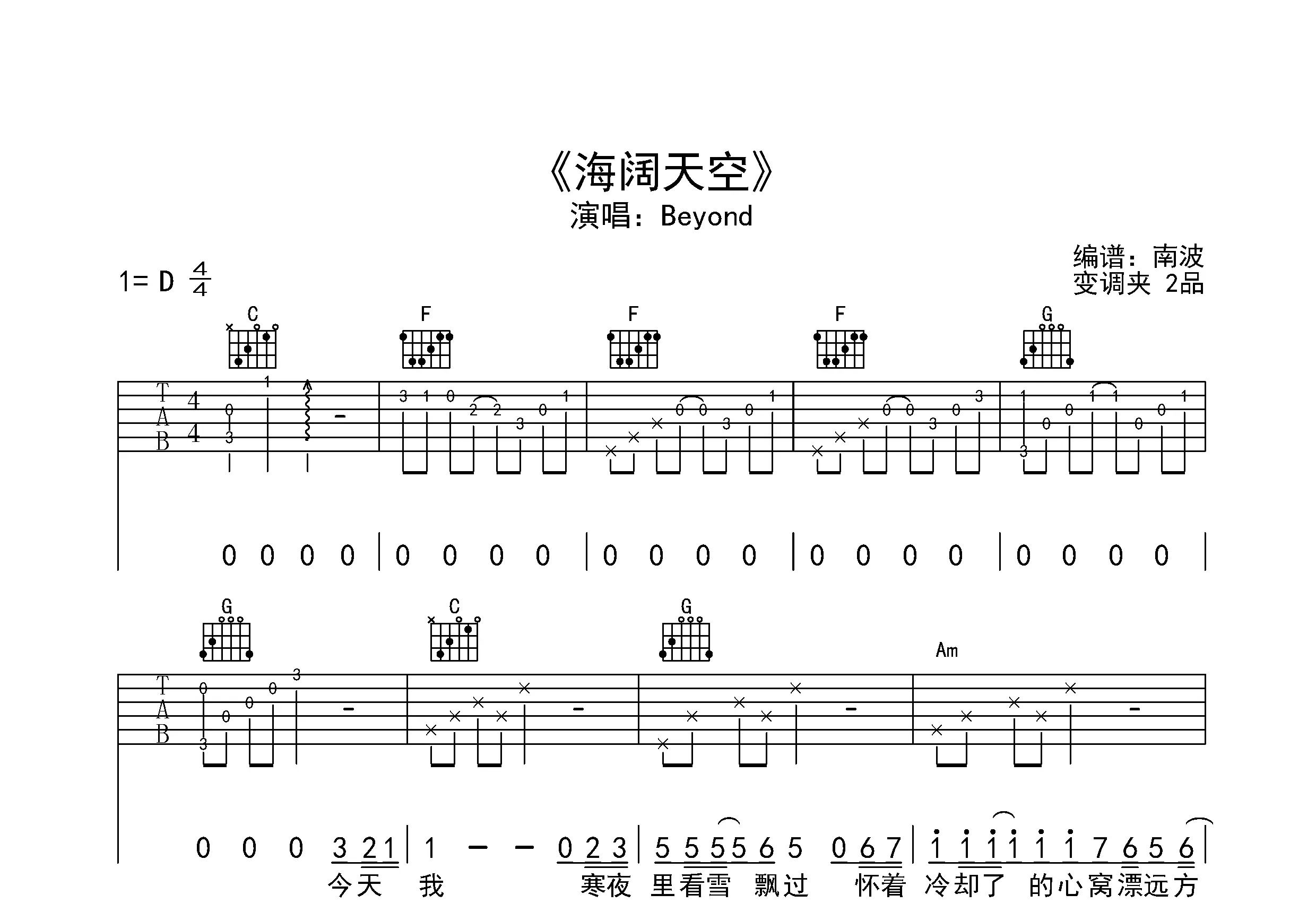 海阔天空吉他谱_c调简单版_beyond_高清六线谱