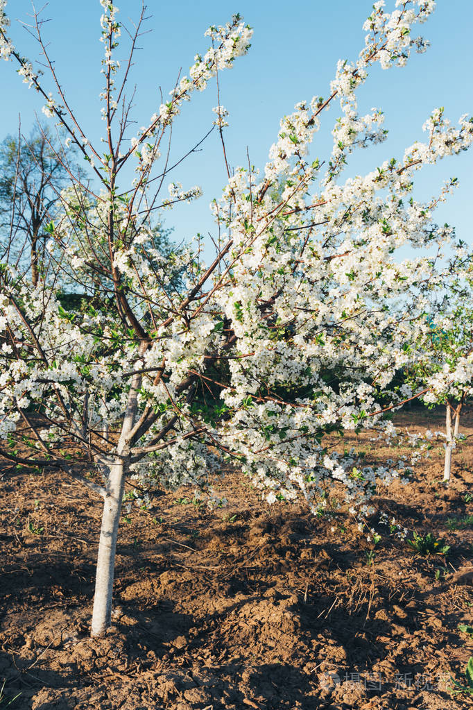 花中的樱桃树樱桃枝花白开在早春的花园里