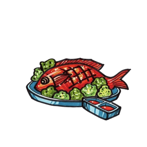 钢笔淡彩手绘美食烤鱼