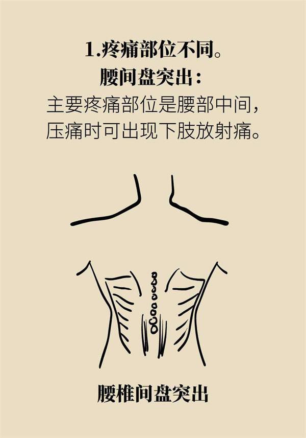 腰肌劳损:疼痛主要集中在腰部,偶尔累及臀部,腿部尤其是膝关节以下