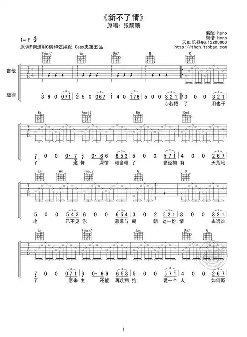 《新不了情》吉他谱六线谱f调_张靓颖