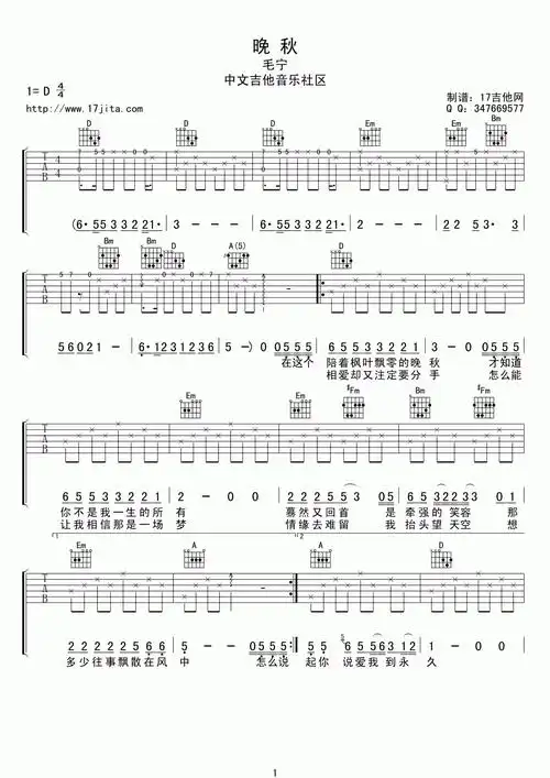 晚秋吉他谱 毛宁-曲谱网