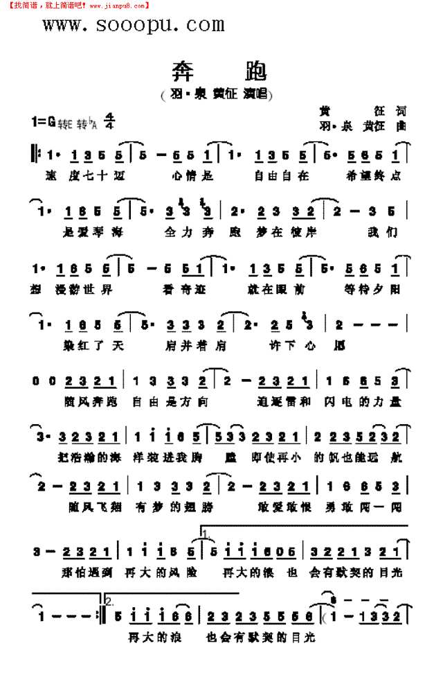 奔跑(黄征词 黄征 羽泉曲)高清打印歌谱简谱