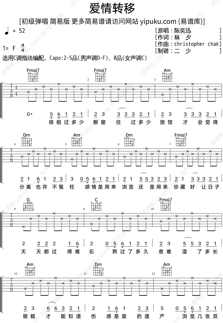 c调版陈奕迅爱情转移吉他谱原版吉他弹唱六线谱guitartabs