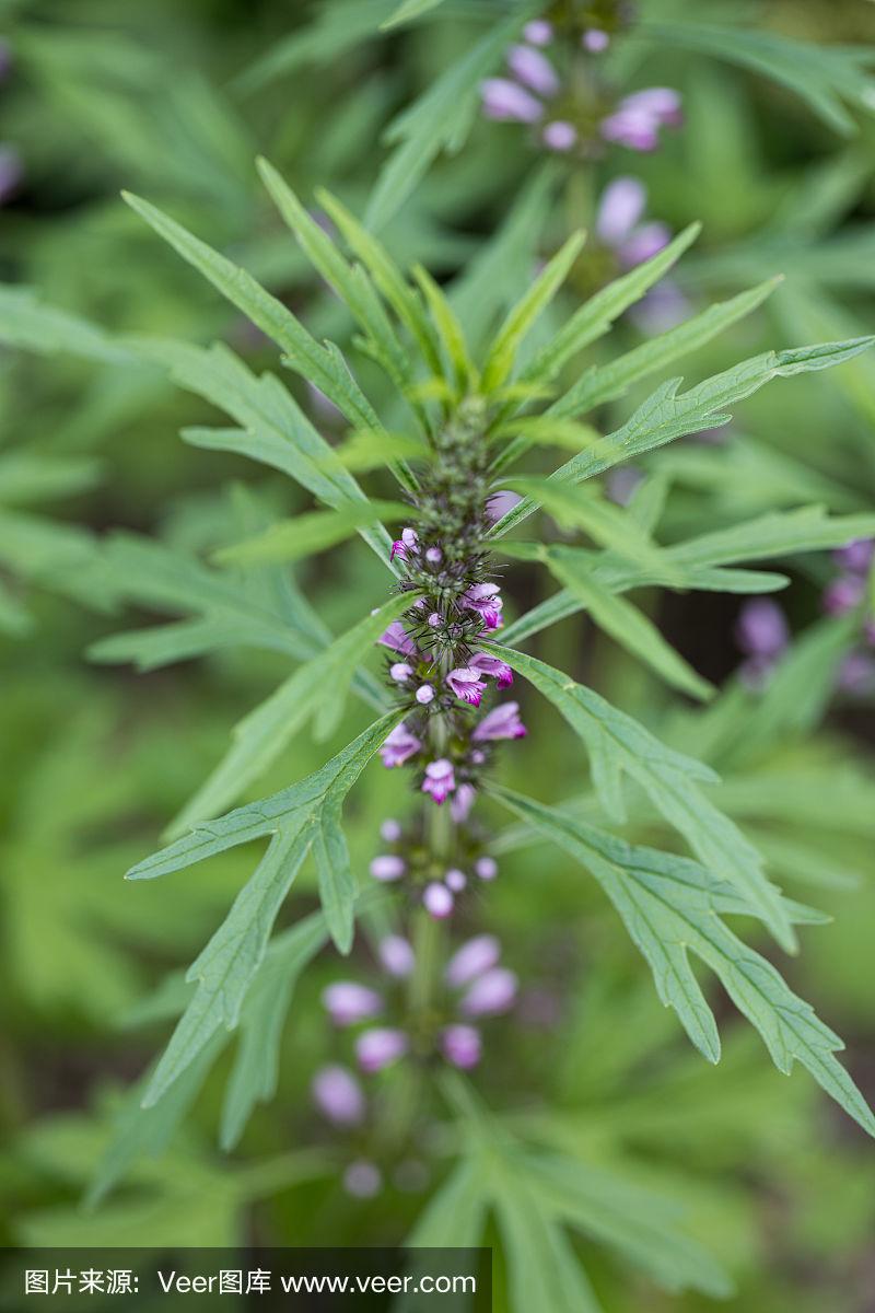 益母草(益母草japonicus)开花植物在一个天然的绿色不鲜明的背景