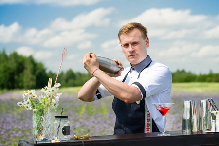 餐饮酒吧服务酒保的工作在出发帅气的调酒师在户外准备鸡尾酒