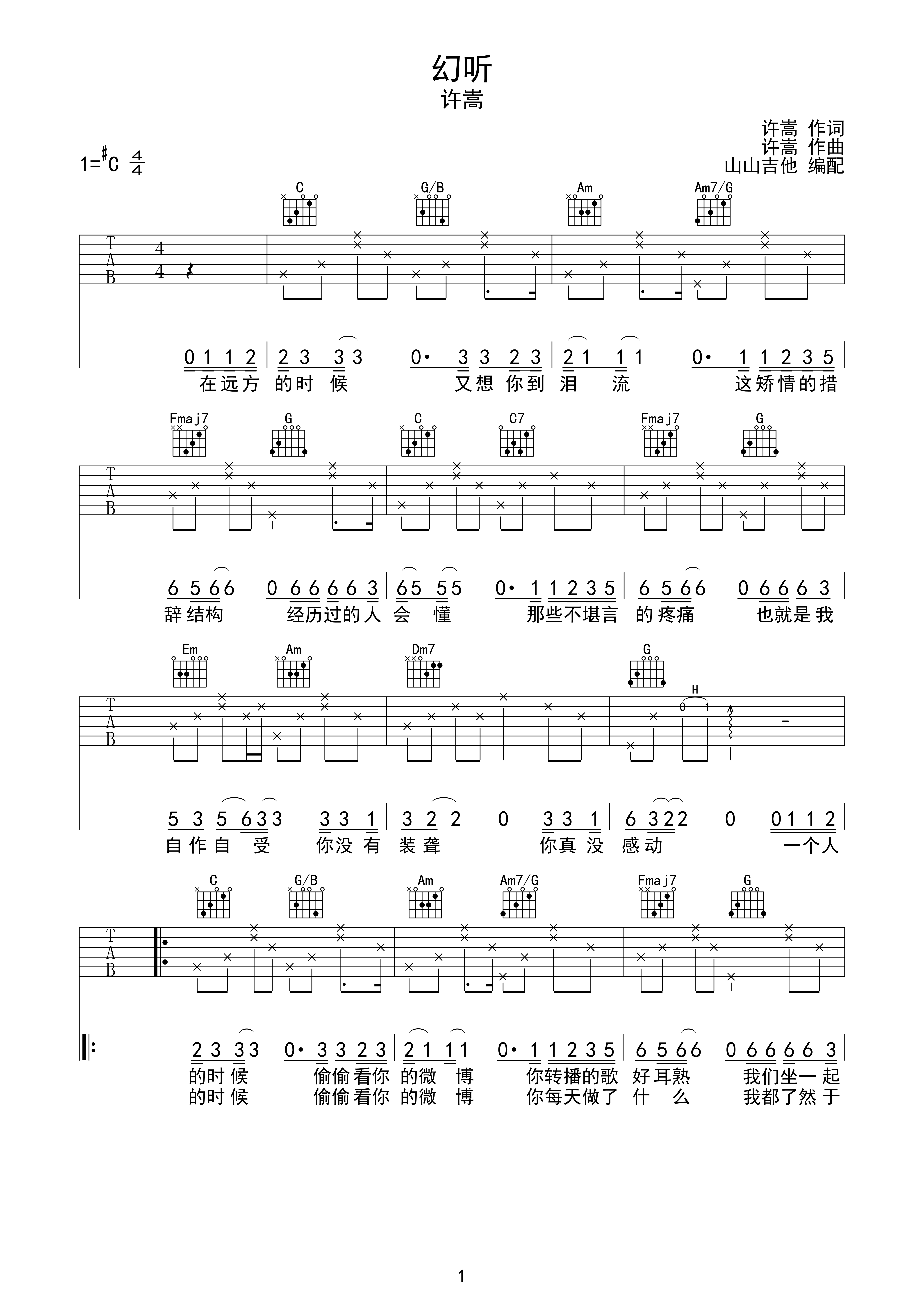 歌曲简谱:许嵩《幻听》免费高清简谱 歌谱下载 流行弹唱网