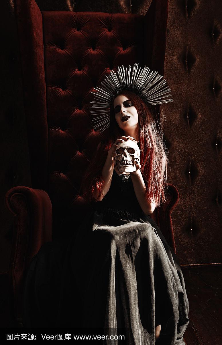 巫女在可怕的女巫鬼故事看,嘴血伤口黑色的长发,工作室灯光暗红色的
