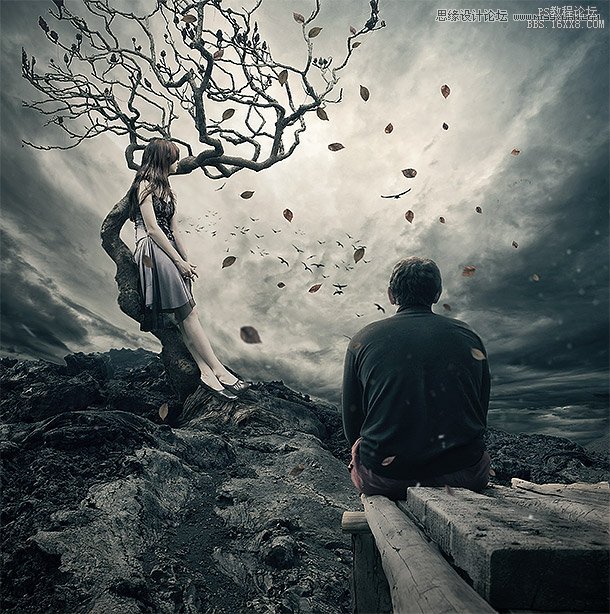 ps合成在枯树下分手的情侣场景
