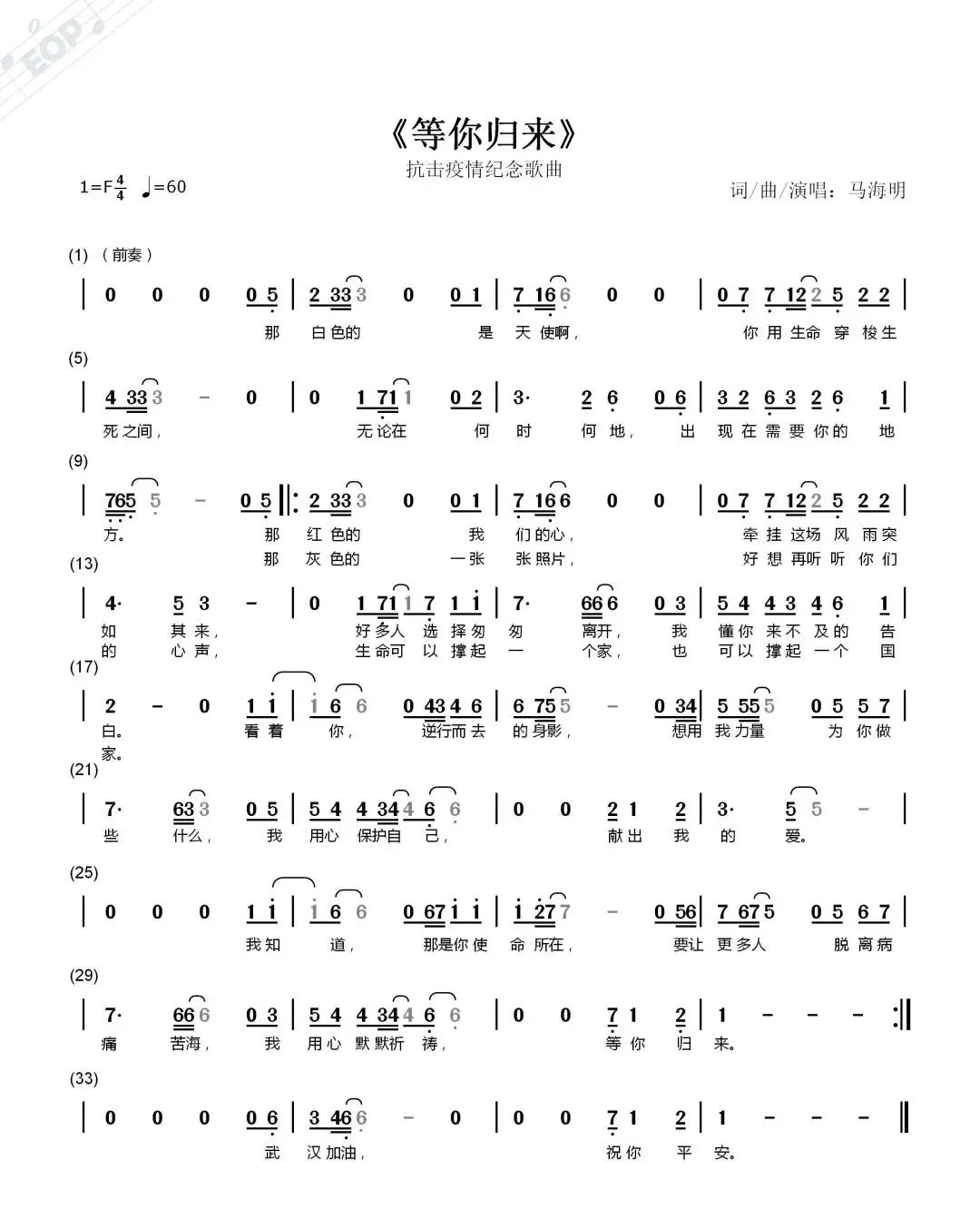 《等你归来》萧思林作词 汪天亮作曲 ,原创歌曲简谱,通俗歌曲,国语
