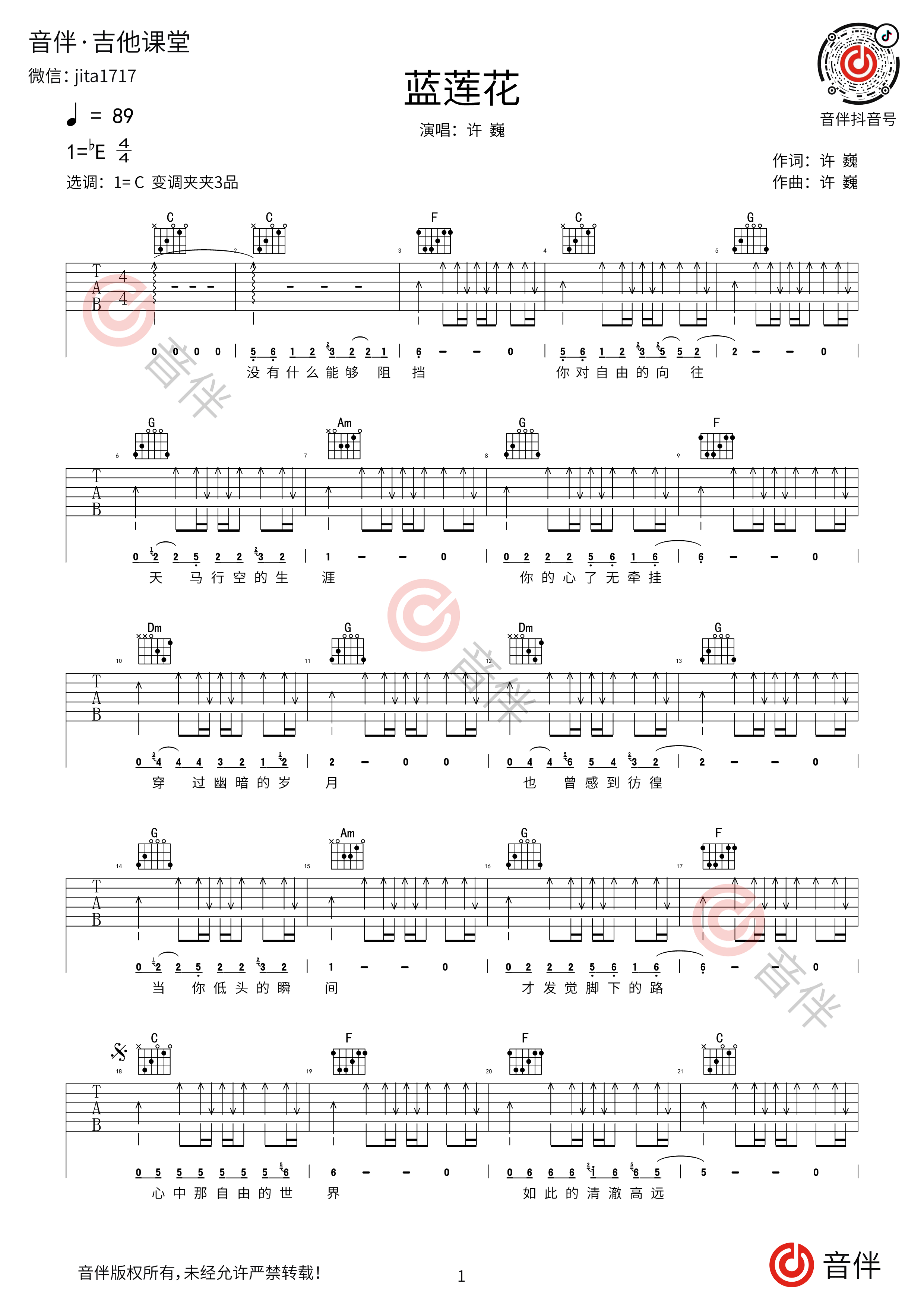 蓝莲花吉他谱 d调附演示_悠音吉他课堂编配_许巍1