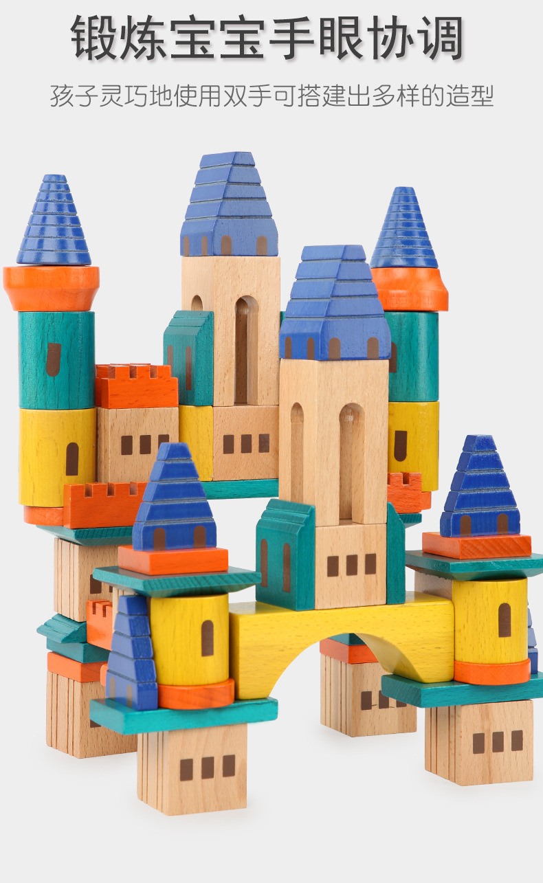 大颗粒榉木彩色城堡拼装积木宝宝幼儿园男孩女孩儿童益智木制玩具
