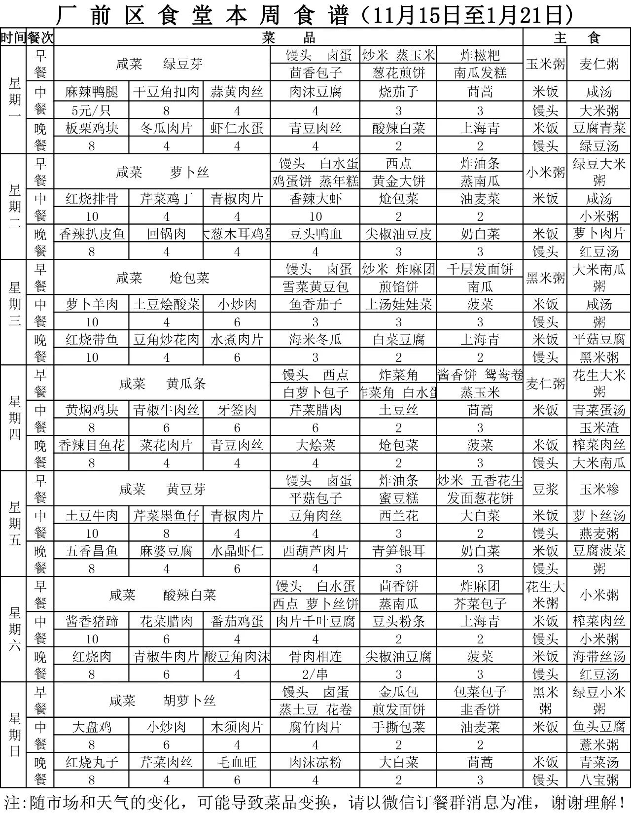 食堂一周食谱
