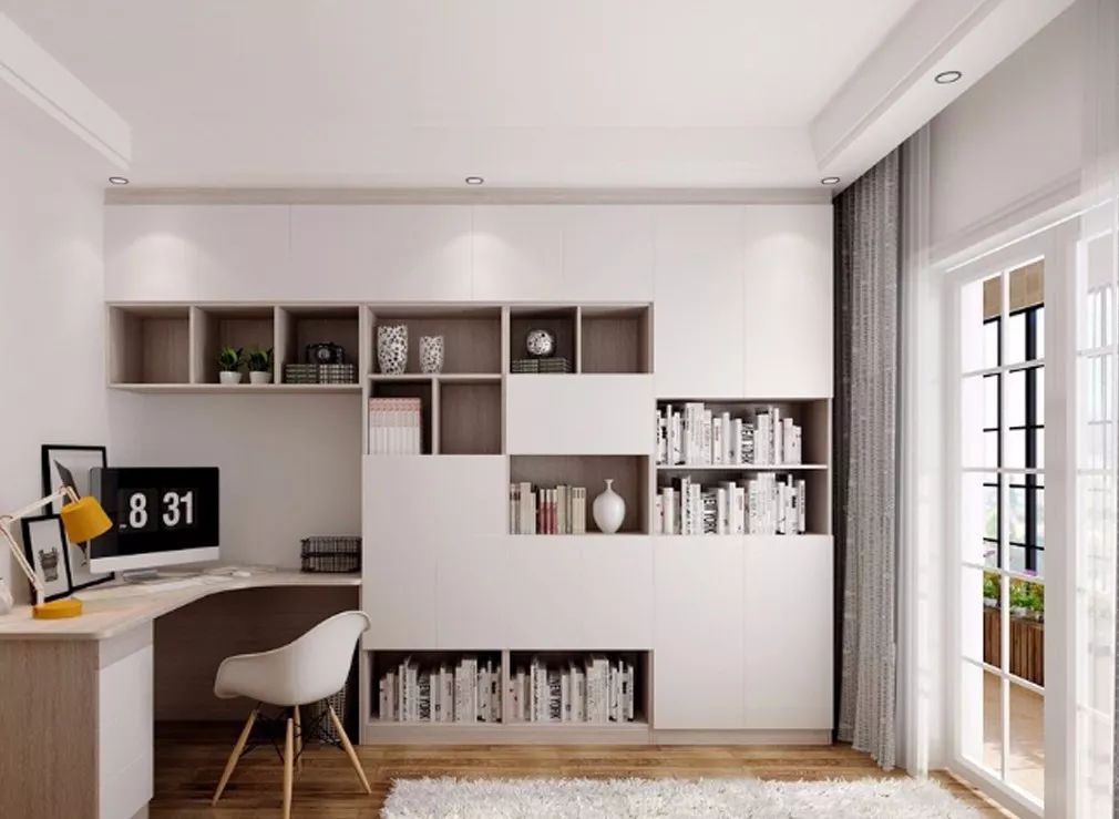 整面墙的收纳柜,白色与木色套色清新,局部镂空玻璃门展示区,放上