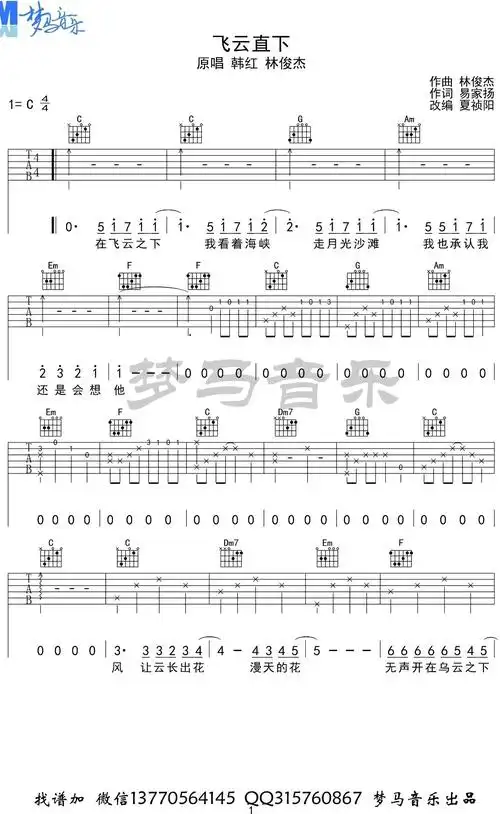 飞云之下吉他谱-弹唱谱-c调-虫虫吉他