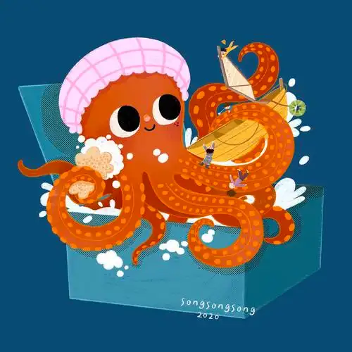 蓝色多脑盒里装了一只超级大章鱼|插画|创作习作|是宋宋宋啊 - 原创