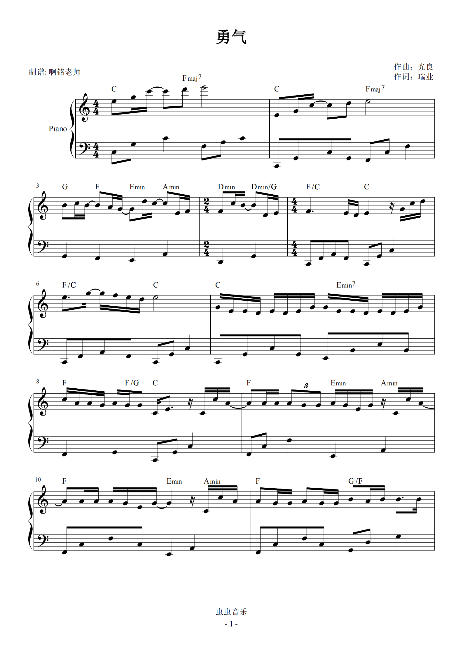 棉子【勇气】钢琴谱-c调-虫虫钢琴