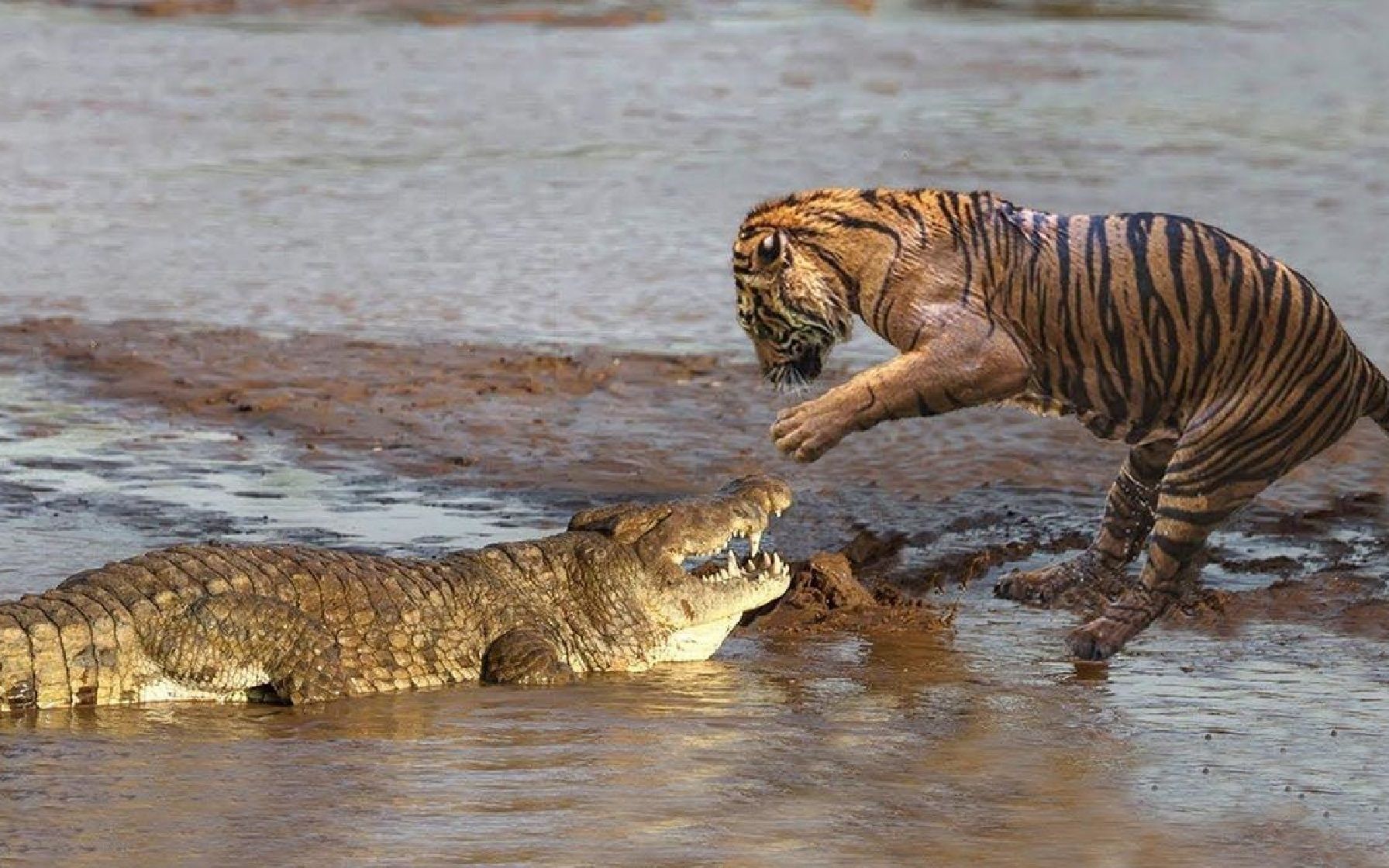 鳄鱼突然从背后攻击老虎,老虎惊慌失措——老虎对鳄鱼