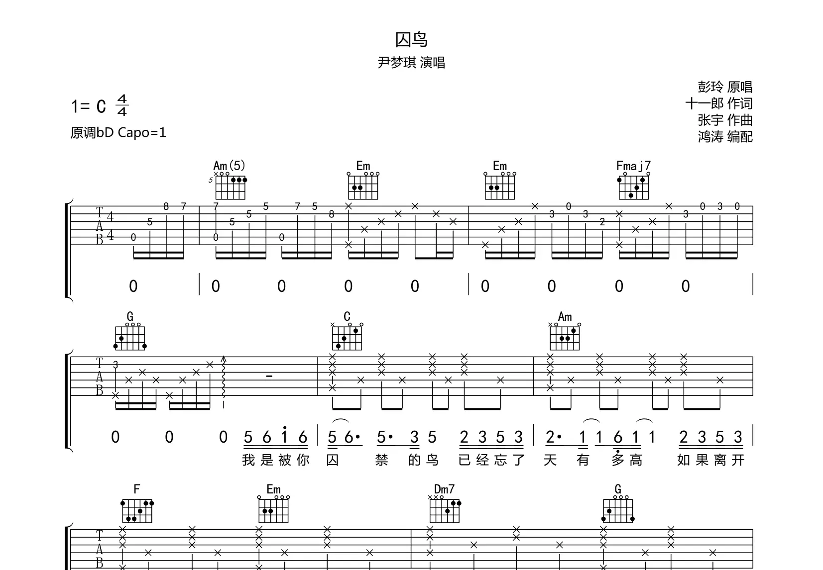 囚鸟吉他谱_尹梦琪_c调弹唱吉他谱72%原版 - 吉他世界