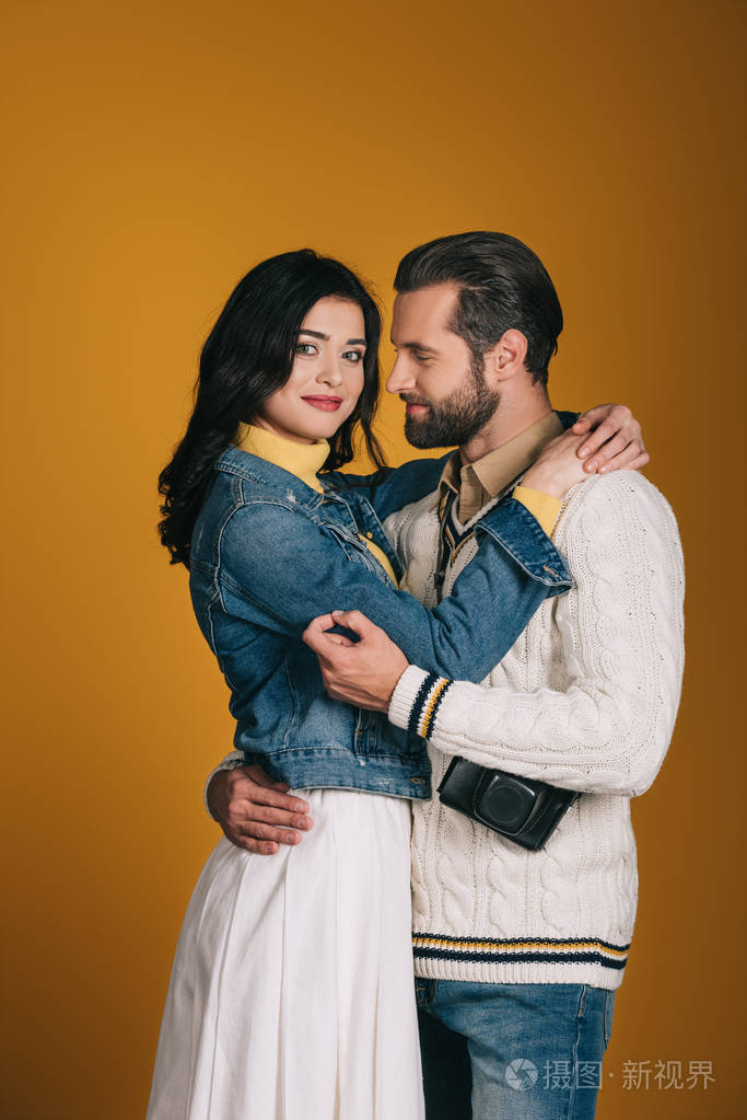 男朋友和女朋友在黄色的环境下拥抱