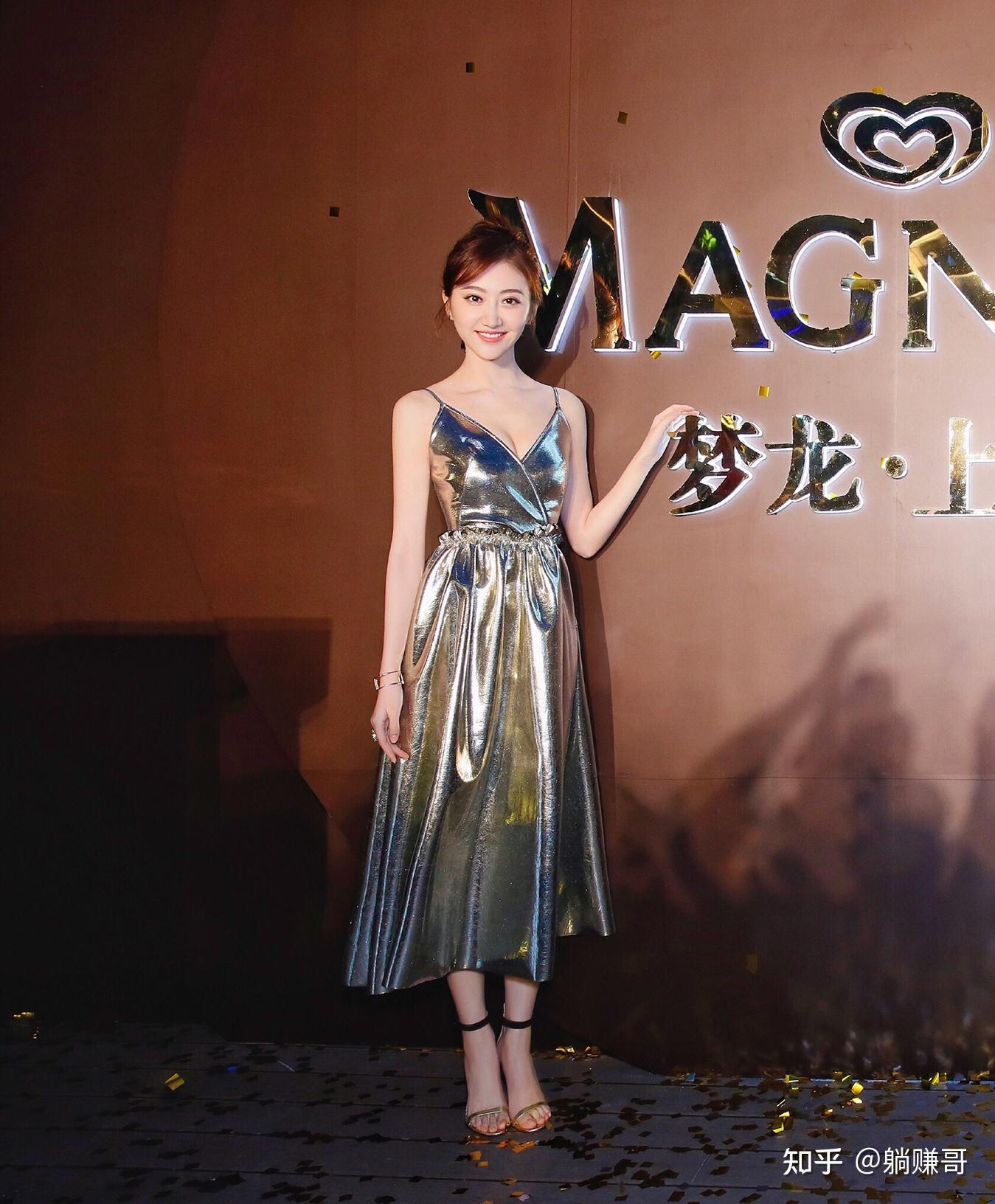 景甜亮相某活动水湖蓝裙恬静柔美