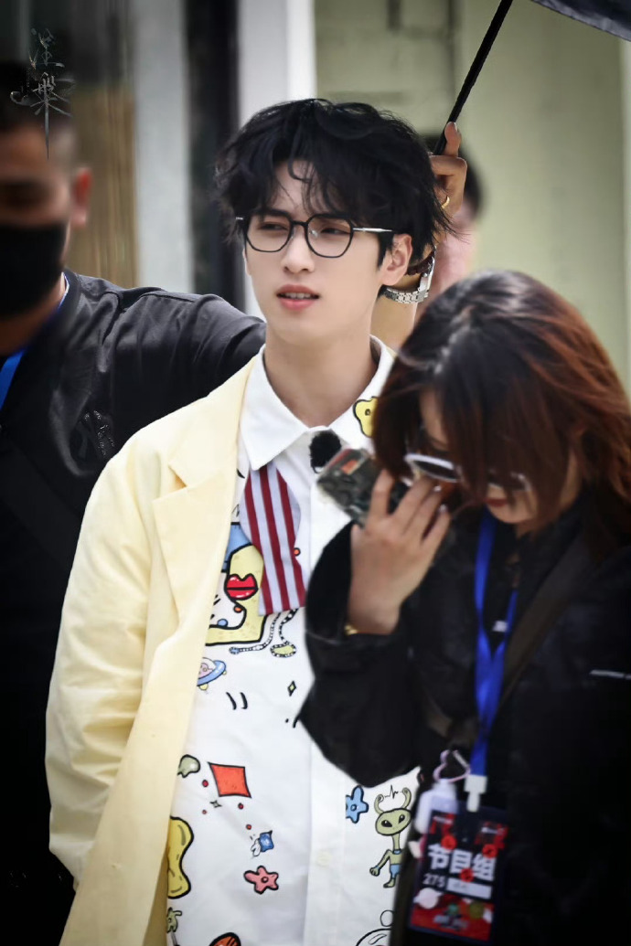 严浩翔今天录制《极限挑战》路透 童趣多巴胺穿搭 黑框眼镜小卷毛