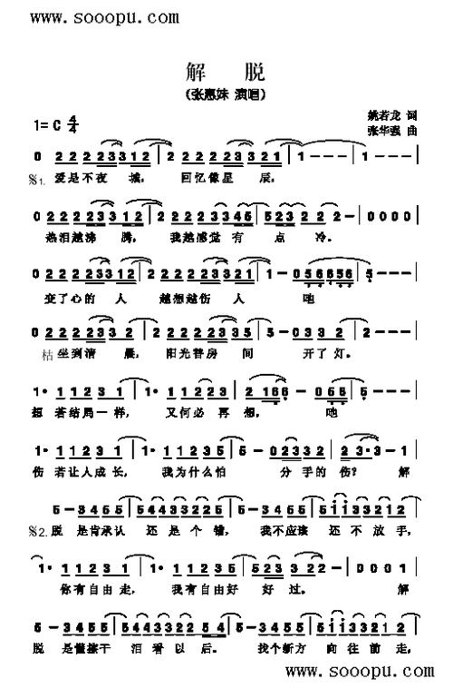 张惠妹解脱简谱,张惠妹解脱歌谱,张惠妹解脱歌词,曲谱,琴谱,总谱