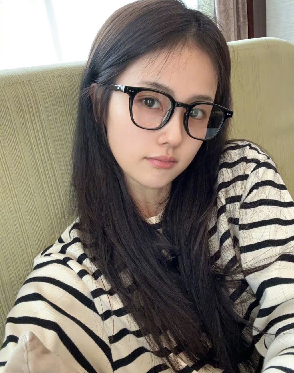 白鹿晒素颜照太减龄,脸上不化妆和小女生一样清新,戴上黑框眼镜更是一