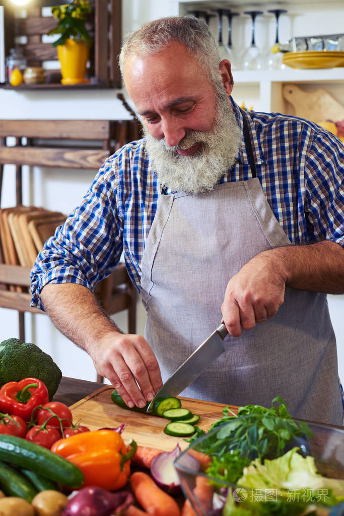 成熟的男人在切菜板上切片黄瓜的侧视图