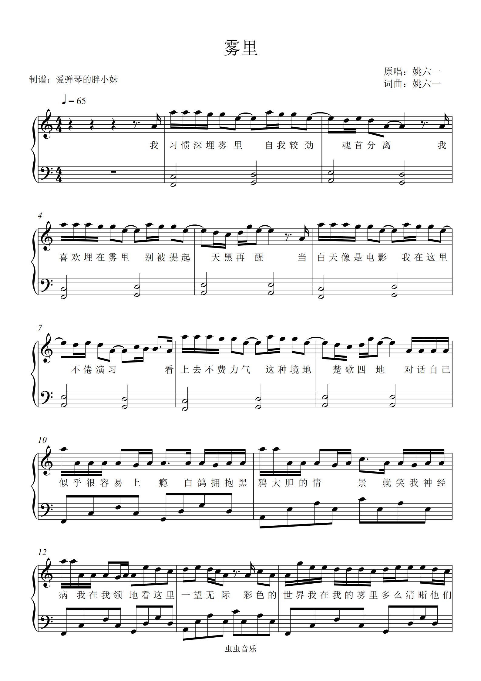 雾里-c调初学者完整版(带歌词)抖音热歌钢琴谱-虫虫钢琴