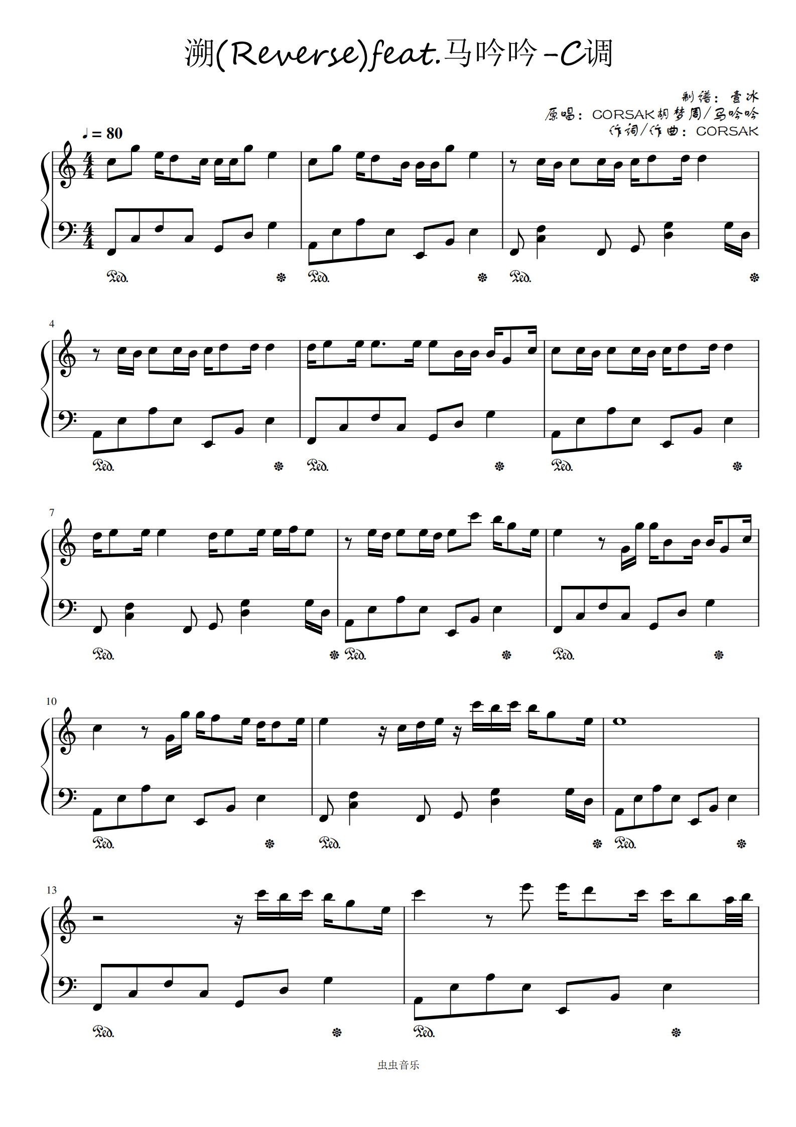 溯(reverse)feat.马吟吟-c调简单易上手钢琴谱-虫虫钢琴