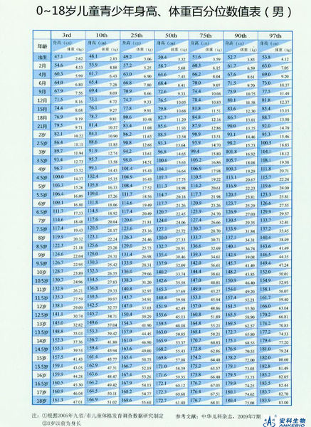 矮小身材,0-18岁儿童少年身高,体重百分位数值表(男)
