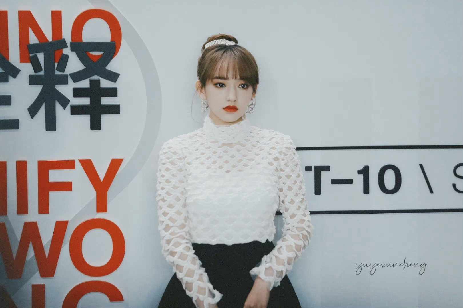 程潇超话#程潇秋日黑白格调#丸子头造型,白色镂空上衣搭黑色短裙,秋日